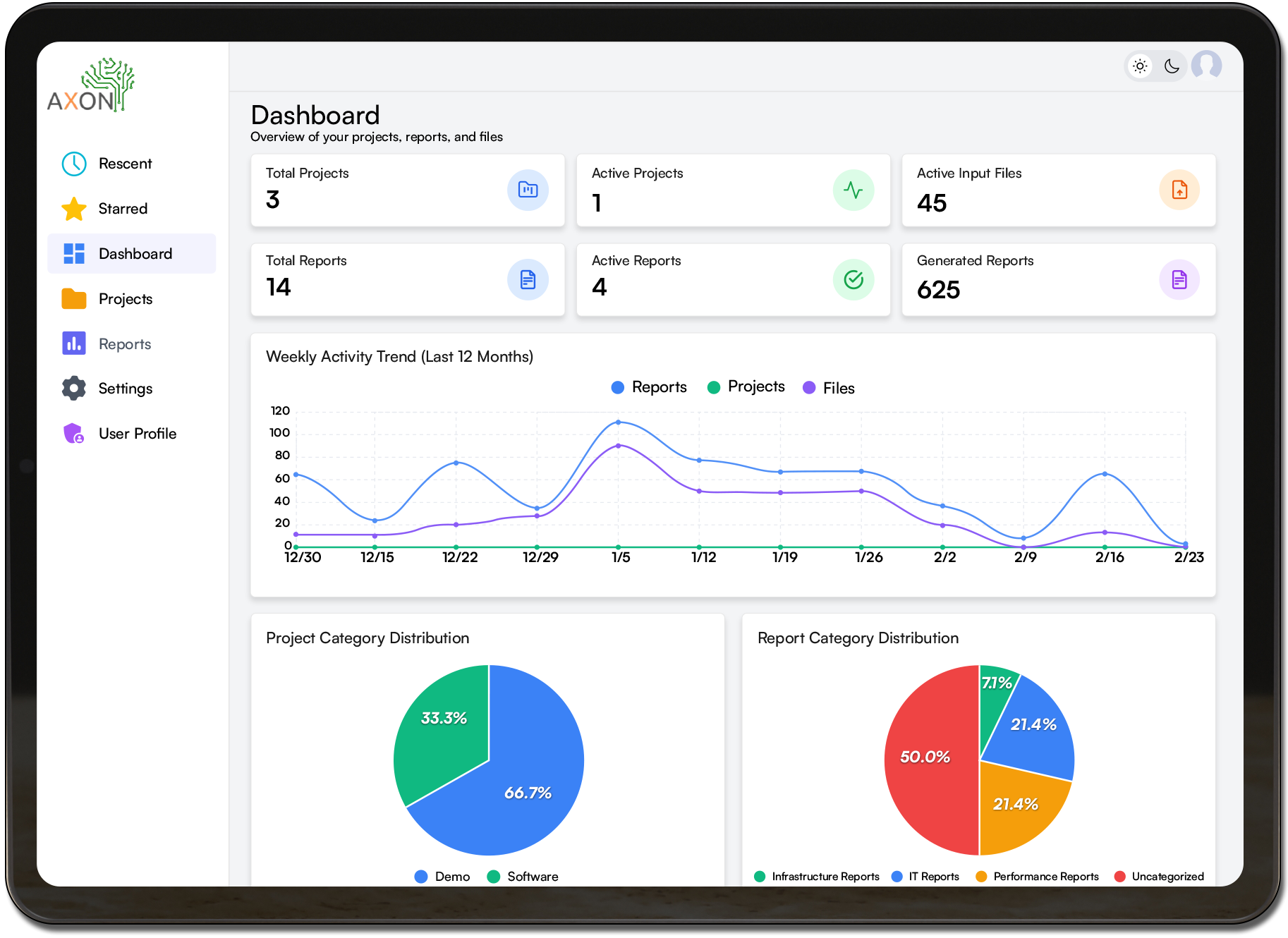 Upload your documents, spreadsheets, transcripts, meeting recordings, or videos. AxonTree converts them into structured data using AI document analysis software, powering AI decision support systems and automated business insights.